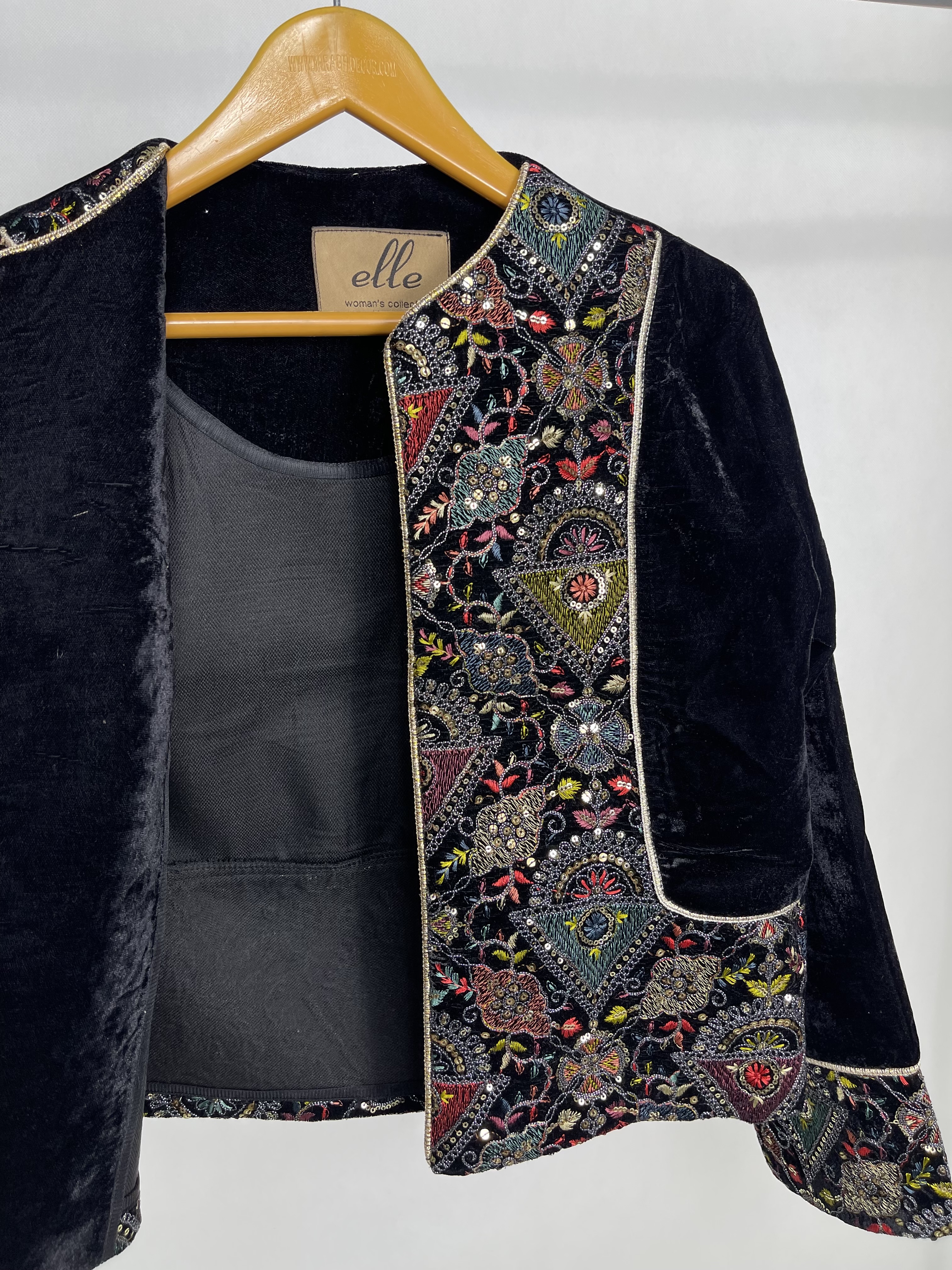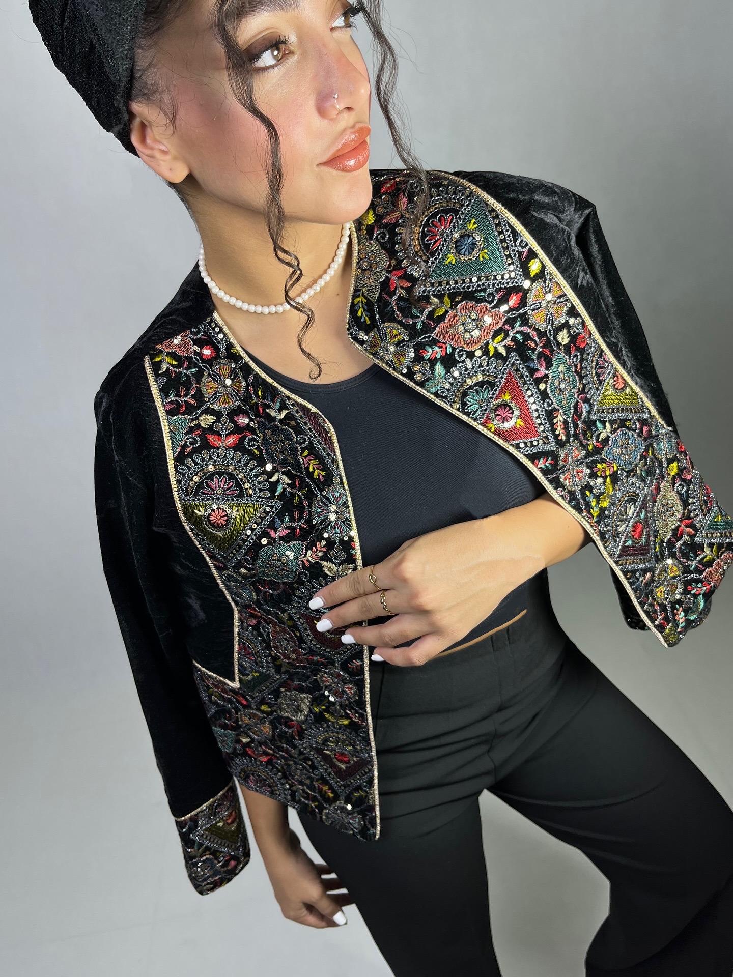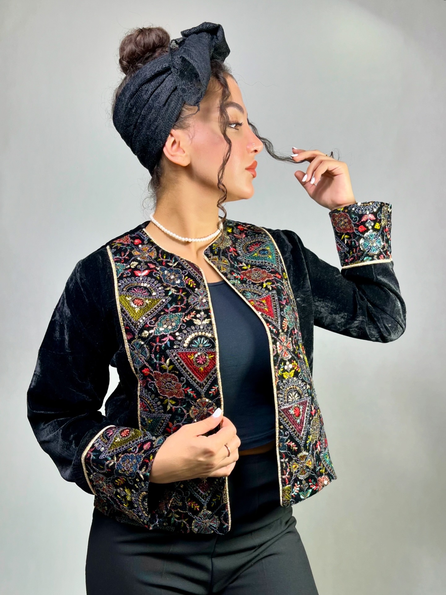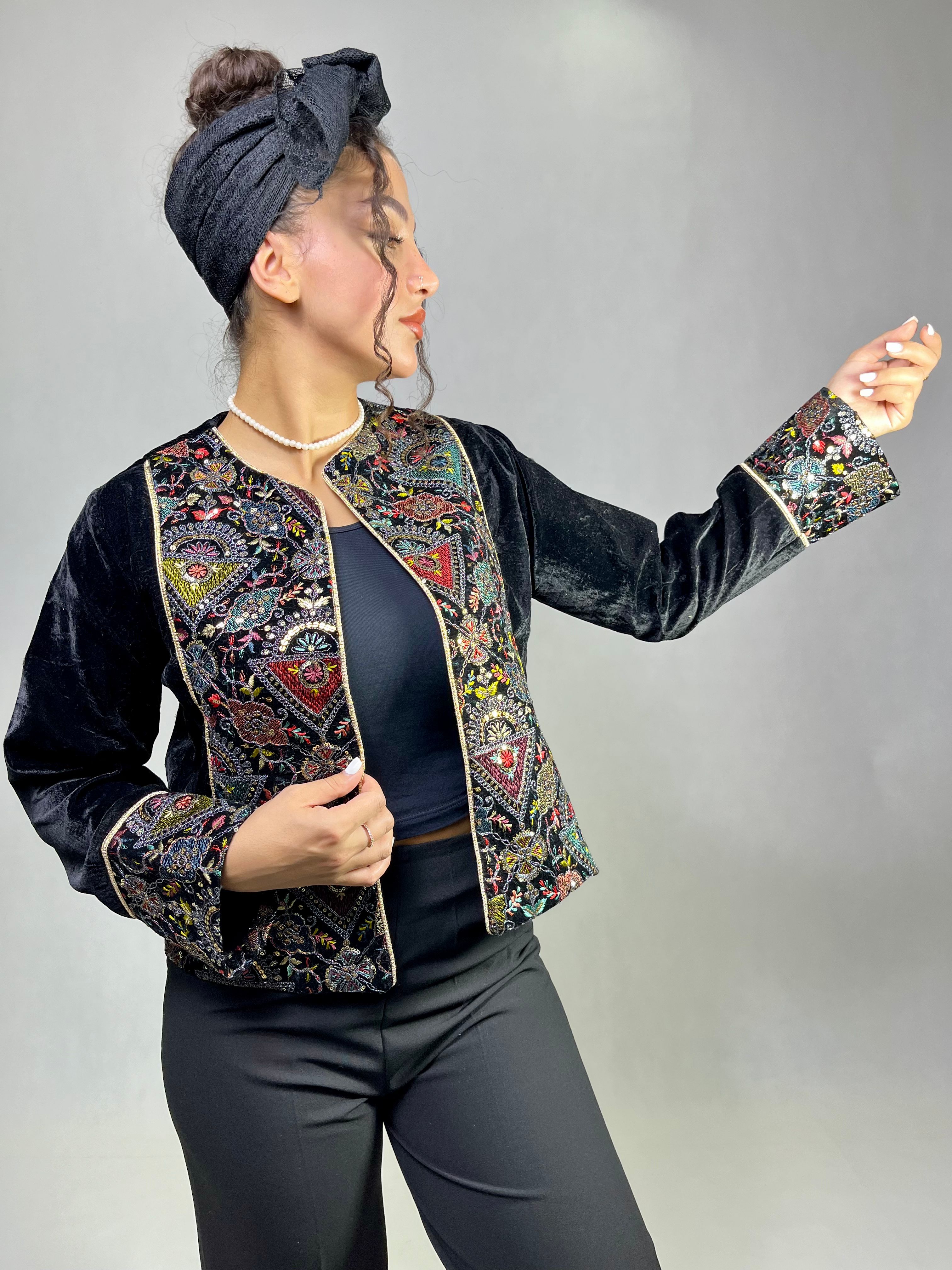 کت مخمل سوزن دوزی شده: یک کت یا مانتوی لاکچری برای یک رویداد خاص، در کمد لباس هر خانم جایگاه خود را دارد. این روزها، سوزن دوزی بسیار ترند شده و این کت مخمل سوزن دوزی شده نیز در همین دسته قرار دارد. این کت بسیار زیبا و شکیل، علاوه بر اینکه استایل شمارا متفاوت می سازد، اصالت چهره ی شرقی شما را نیز دو چندان می نماید. ست کردن کت: کت سوزن دوزی شده، را می توانید با یک تاپ و دامن، یک پیراهن کوتاه و یا حتی با شلوار نیز ست کنید. طرح و رنگ کت: رنگ های زنده ی به کار رفته در این سوزن دوزی تضاد زیبایی را با زمینه ی مشکی کت، ایجاد کرده که ناخودآگاه، تاثیر به سزایی در جذب نگاه اطرافیان، می گذارد. نقش های هندسی نامنظم دوخته شده روی این کت، ذهن را از عیب اندامی شما ( اگر لاغر و یا چاق هستید ) دورمی کند.
