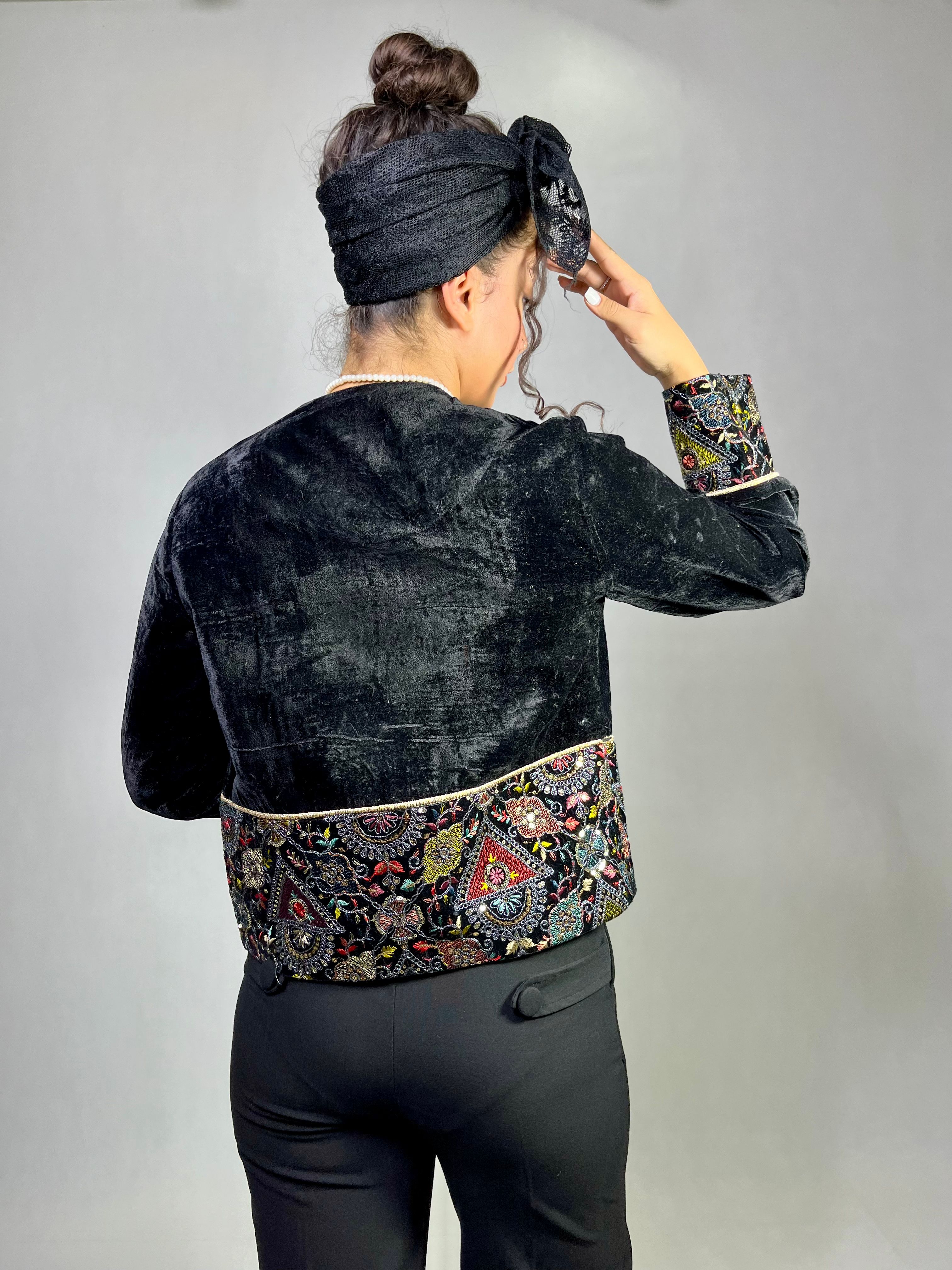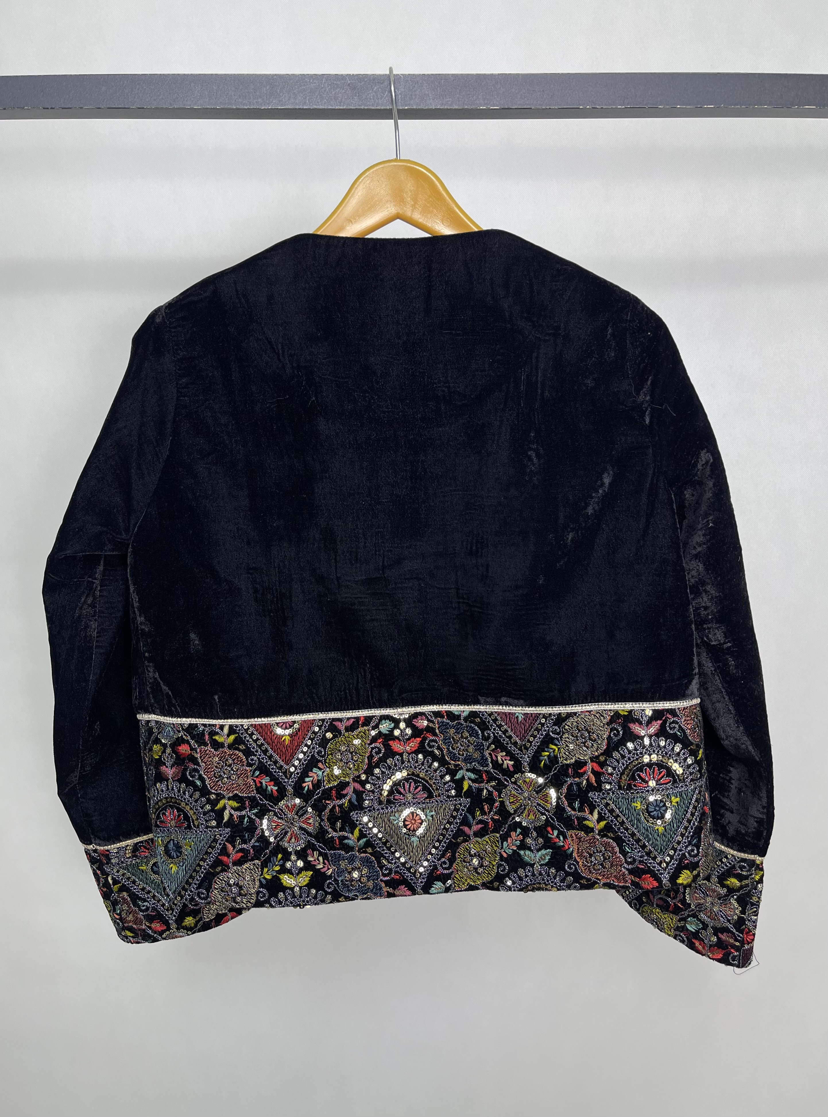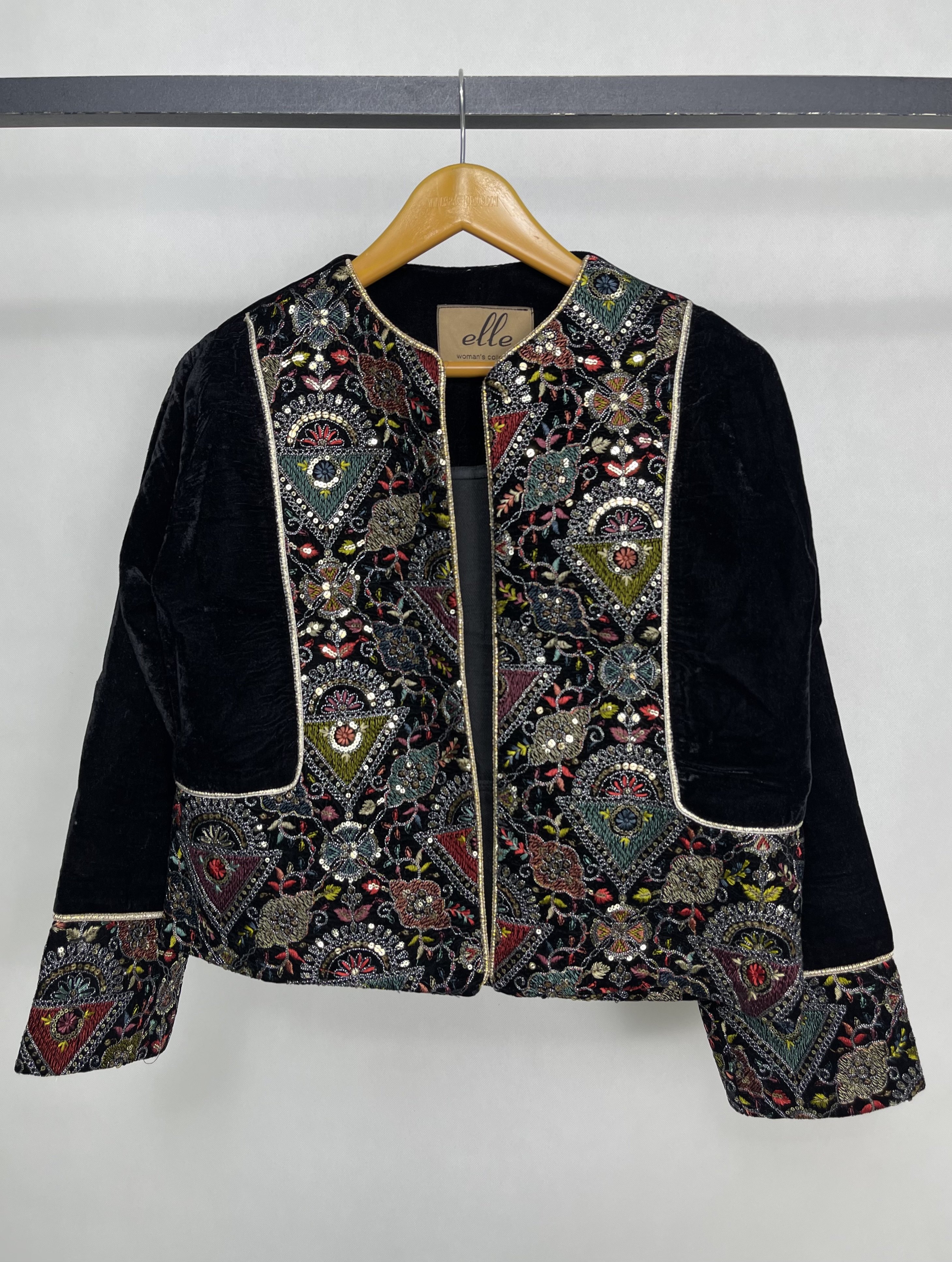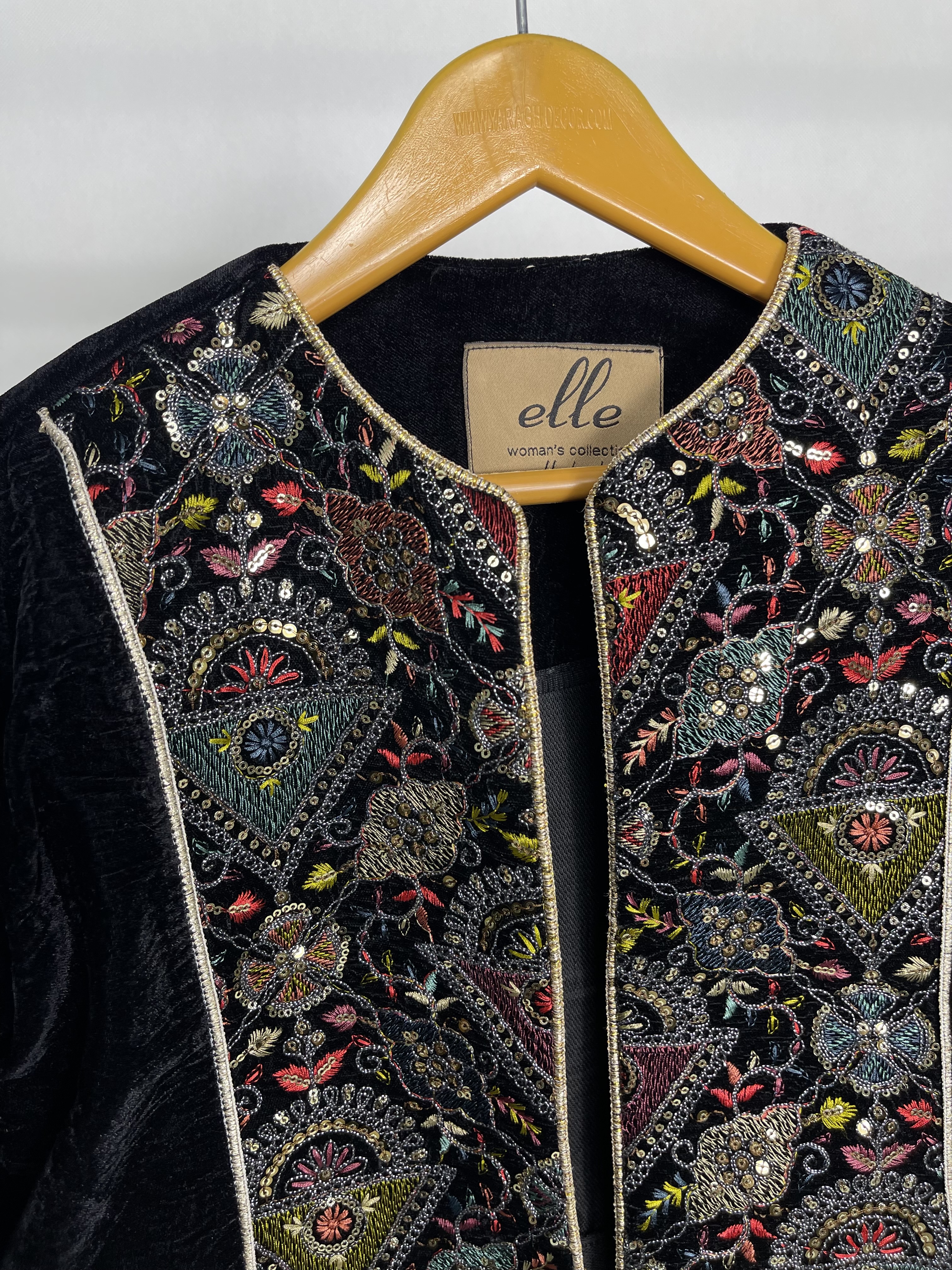 کت مخمل سوزن دوزی شده: یک کت یا مانتوی لاکچری برای یک رویداد خاص، در کمد لباس هر خانم جایگاه خود را دارد. این روزها، سوزن دوزی بسیار ترند شده و این کت مخمل سوزن دوزی شده نیز در همین دسته قرار دارد. این کت بسیار زیبا و شکیل، علاوه بر اینکه استایل شمارا متفاوت می سازد، اصالت چهره ی شرقی شما را نیز دو چندان می نماید. ست کردن کت: کت سوزن دوزی شده، را می توانید با یک تاپ و دامن، یک پیراهن کوتاه و یا حتی با شلوار نیز ست کنید. طرح و رنگ کت: رنگ های زنده ی به کار رفته در این سوزن دوزی تضاد زیبایی را با زمینه ی مشکی کت، ایجاد کرده که ناخودآگاه، تاثیر به سزایی در جذب نگاه اطرافیان، می گذارد. نقش های هندسی نامنظم دوخته شده روی این کت، ذهن را از عیب اندامی شما ( اگر لاغر و یا چاق هستید ) دورمی کند.